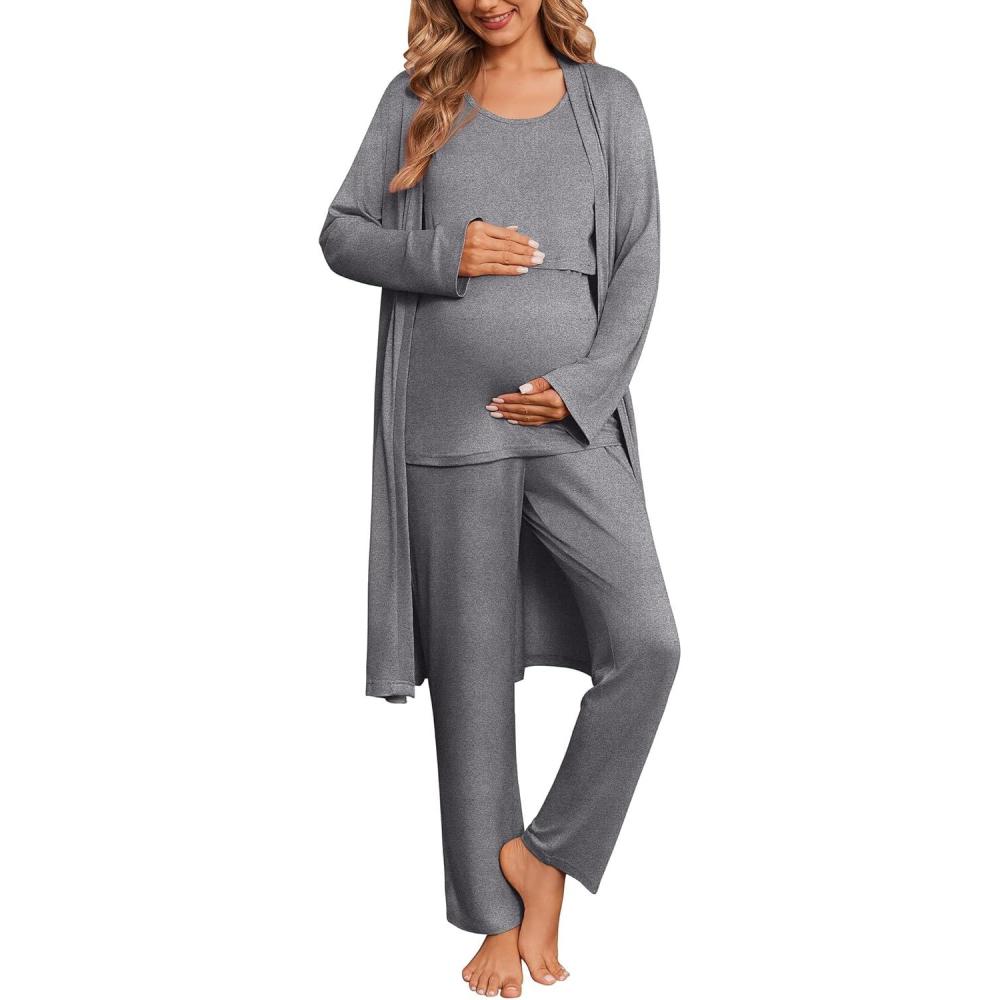 Ekouaer Nursing Pajamas Maternity Robe Set 3 Pieces Postpartum Maternity Pajama Set Pregnancy Breastfeeding Pj(Deep Grey)