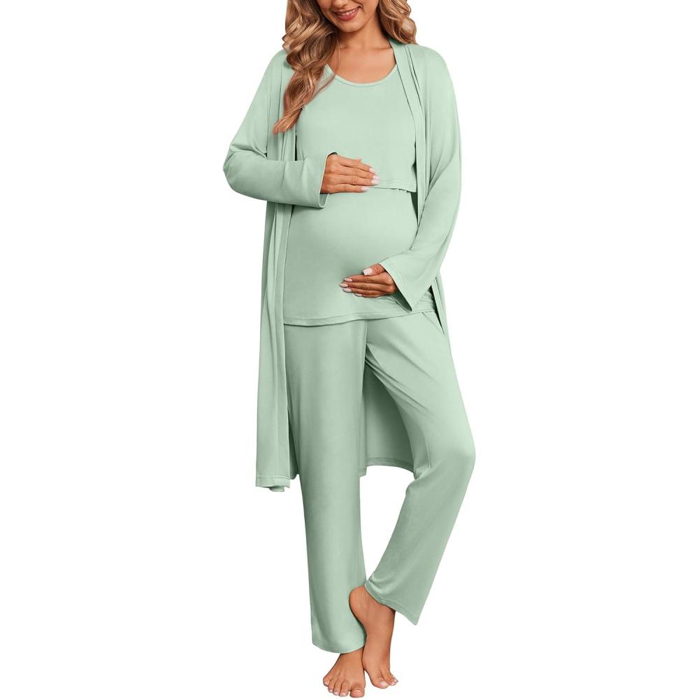 Ekouaer Nursing Pajamas Maternity Robe Set 3 Pieces Postpartum Maternity Pajama Set Pregnancy Breastfeeding Pj(Light Green)